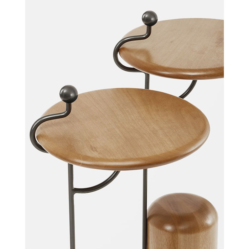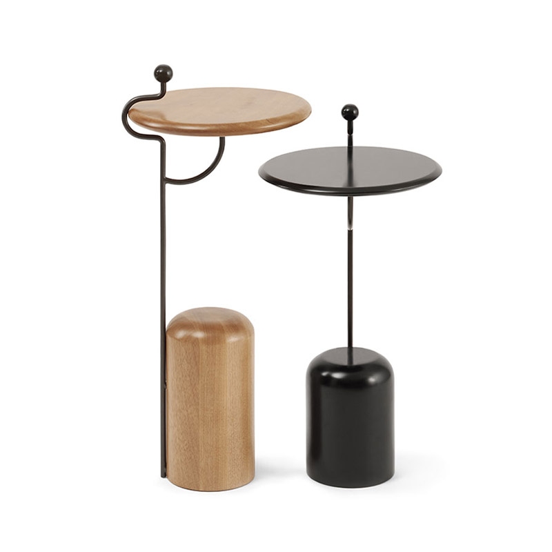 A mesa lateral Órbita possui tampo e base em madeira maciça ou em MDF laqueado. Sua estrutura é feita em aço carbono com ponteira em madeira laqueada.